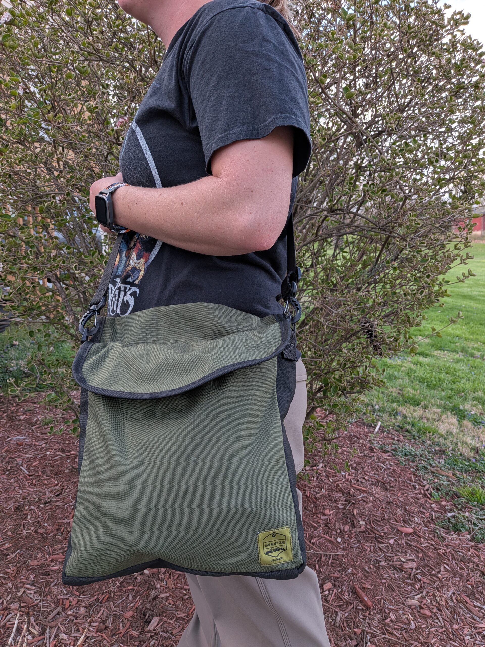 These are the last two remaining game bags. They were designed to be worn with a belt, and later we added D rings and a strap. These work great in the woods, or in the garden as gathering bags. That strap IS included, and along with being adjustable, has a small shoulder pad.